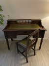 Vendo scrittoio umbertina fine 800 in perfette condizioni noce completa di sedia con gambe tornate 2 cassetti su ogni lato e uno pił grande centrale co serratura e chiave. Piano estraibile rivestito larghezza 120 profonditą 60 altezza 80