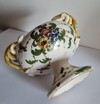 Coppa vintage da collezione in ceramica maiolica decorata con motivi floreali .Manici a serpente.Firmata sul fondo.Dimensioni cm .15 x cm .13 base diametro cm 8.In buono stato senza rotture o filature.Piccole mancanze solo di smalto. Vendo € 48