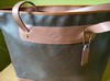 Borsa a tracolla. Come nuova, di notevoli dimensioni. In pelle semirigida colore marrone effetto cashmere con inserti e maniglie in cuoio chiaro e chiusura a cerniera. Misura base cm 45 e altezza cm 40 (escluse maniglie). Tasca interna con cerniera.