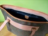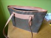 Borsa a tracolla. Come nuova, di notevoli dimensioni. Pelle semirigida colore marrone effetto cashmere con inserti e maniglie in cuoio chiaro, chiusura a cerniera. Misura base cm 45 e alt. cm 40 (escluse maniglie). Tasca interna con cerniera. € 40
