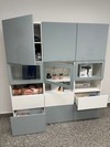 Vendo armadio modello Besta Ikea, bianco e blu/grigio chiaro, con vetrine e cassetti, a 3 ante, per salotto o camera.
