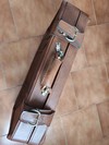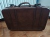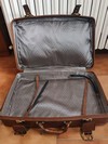 Valigia vintage, interno foderato con motivo geometrico, dotata di cinghie per bloccare i vestiti. Presenta una maglia rinforzata e cinghie esterne che fungono sia da elemento decorativo che di sicurezza per la chiusura, oltre a due serrature con le proprie chiavi.