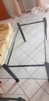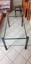 Tavolo in cristallo con gambe in legno con alcuni fori di tarlo ormai morto,in buono stato, misure: lunghezza 180cm. larghezza 85cm. altezza 73cm. € 300